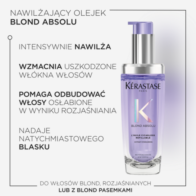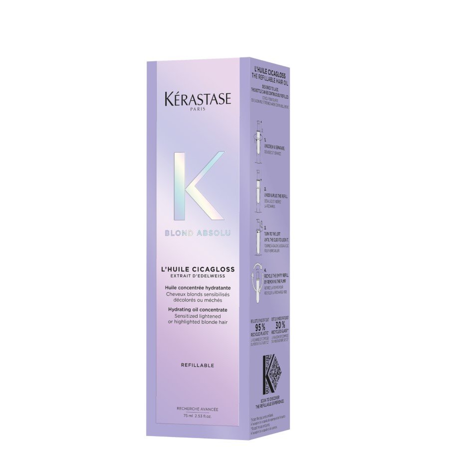 Olejek Blond Absolu Cicagloss z możliwością ponownego uzupełniania zapewnia intensywne nawilżenie, wzmacnia uszkodzone włókna i pomaga odbudować włosy osłabione w wyniku rozjaśniania i nadaje im natychmiastowy blask. Wzbogacony ekstraktem z kwiatu szarotki alpejskiej, rośliny będącej ekstremofilem, rosnącej w Alpach Szwajcarskich na wysokościach do 3000 m n.p.m., wytrzymującej wpływ silnych wiatrów, wysokiego promieniowania UV i niskich temperatur. Delikatny sposób ekstrakcji pozwala na zachowanie mocy składników zwiększających wytrzymałość.